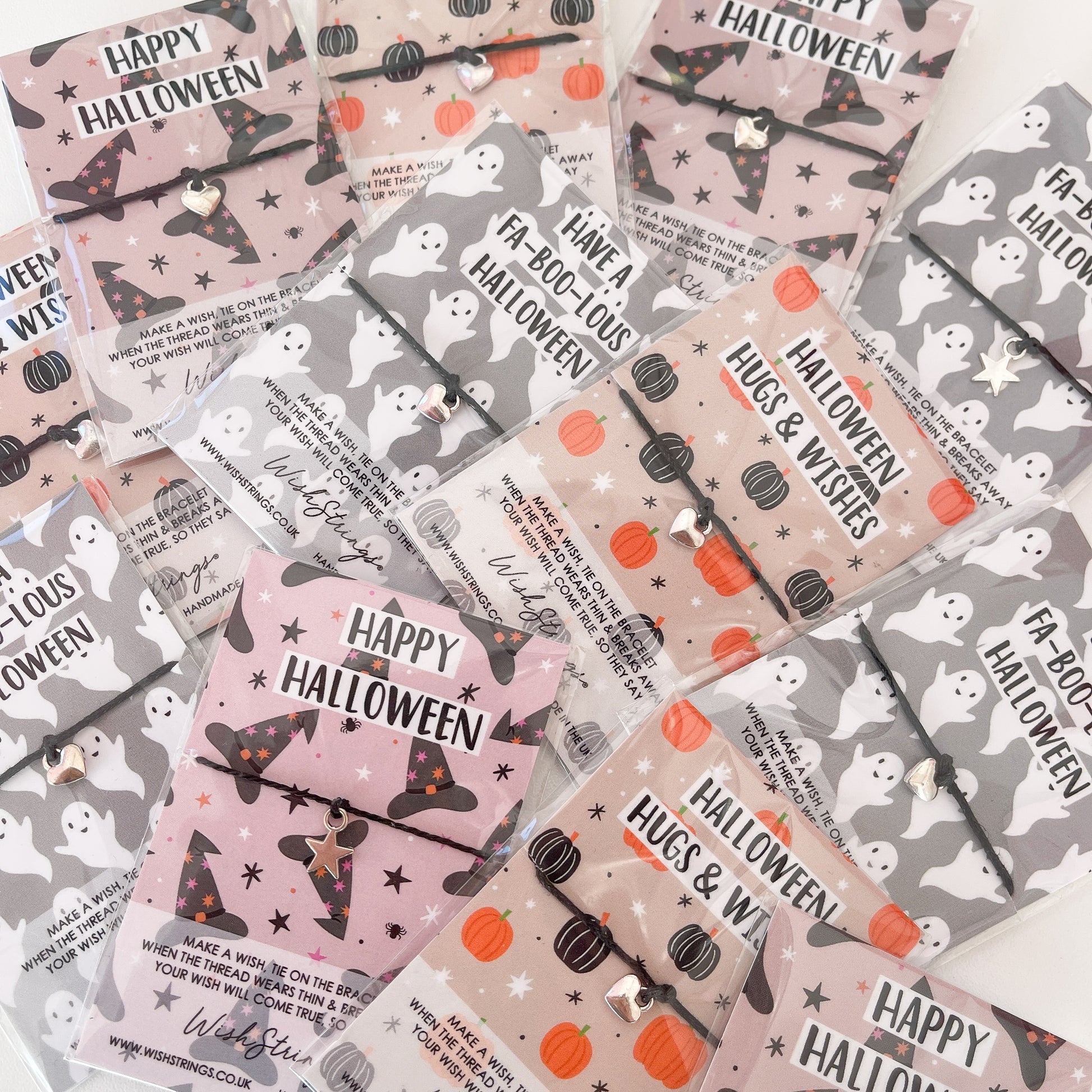 Each bundle includes 12 handmade WishStrings bracelets featuring a variety of Halloween-inspired designs — perfect for autumn displays, Halloween events, and seasonal gift tables.